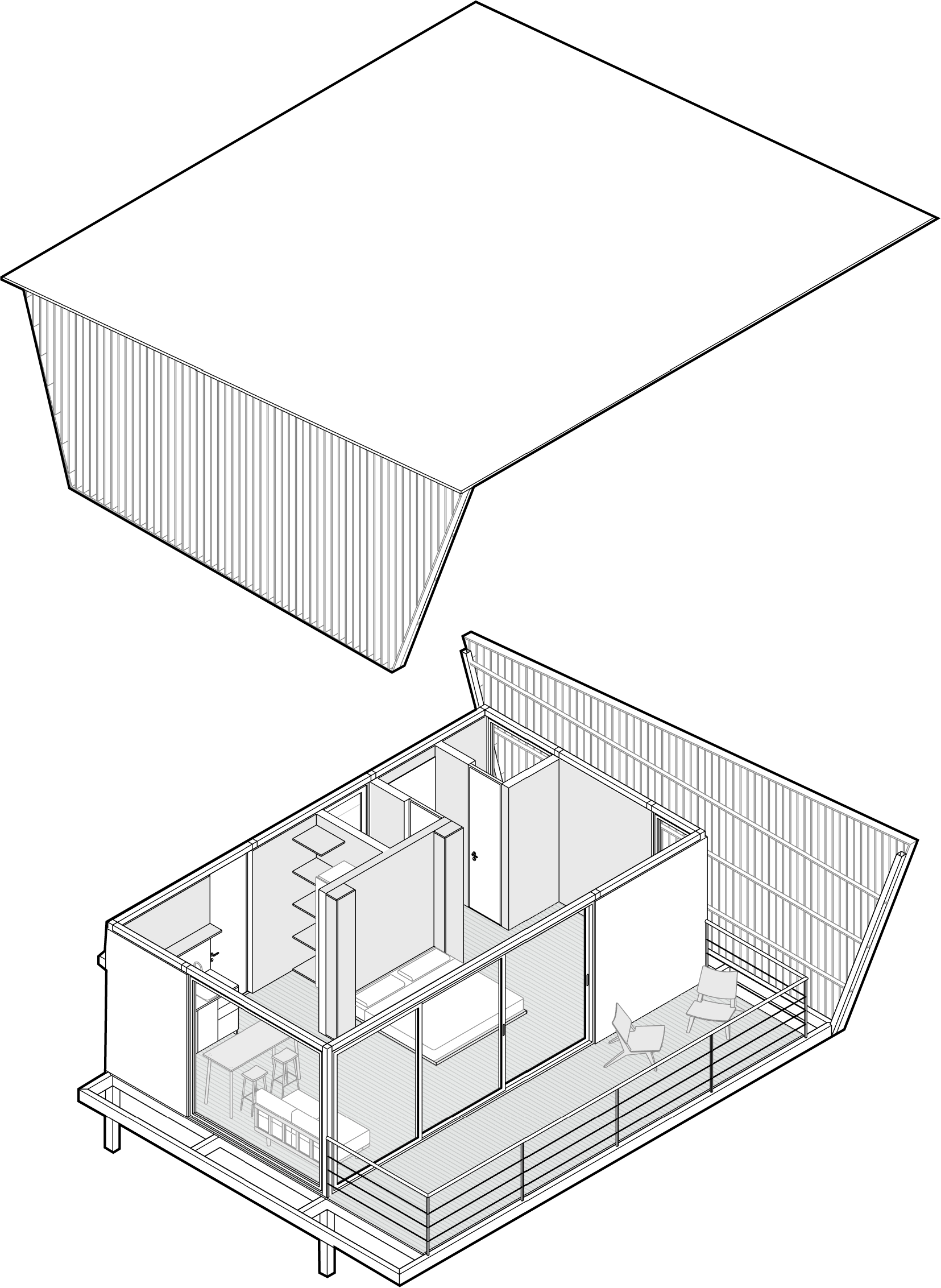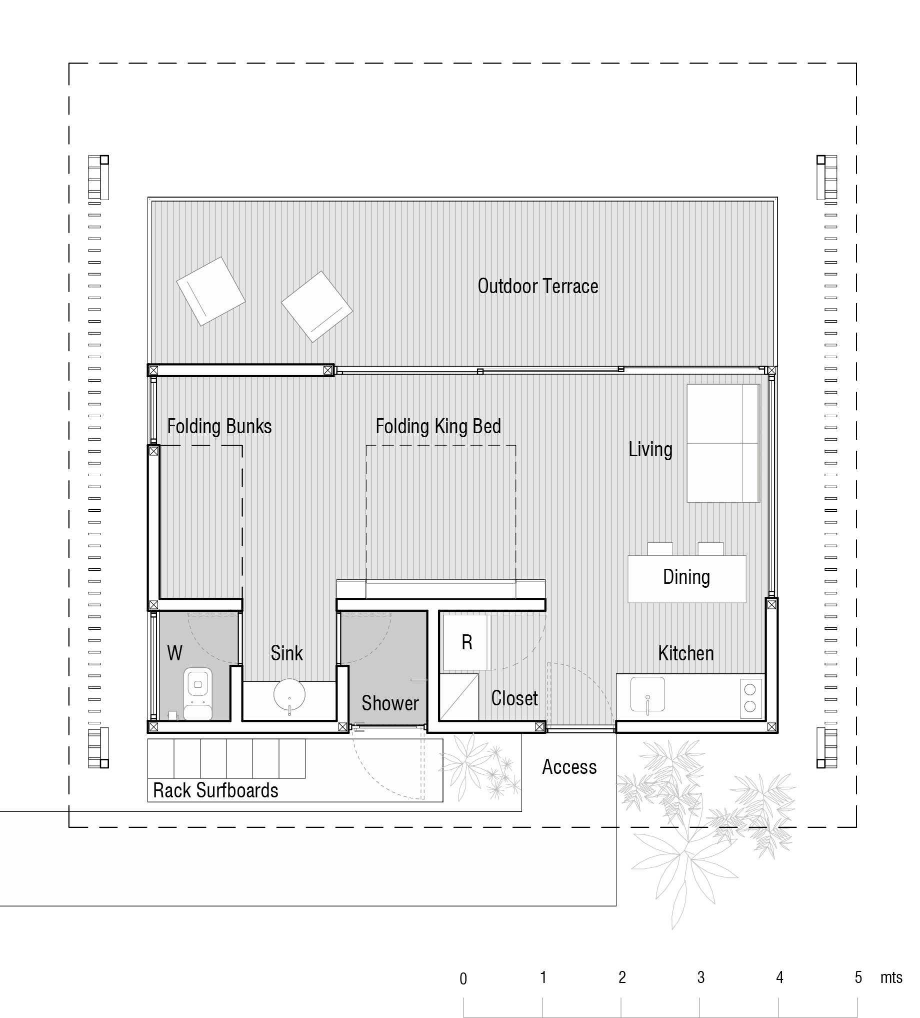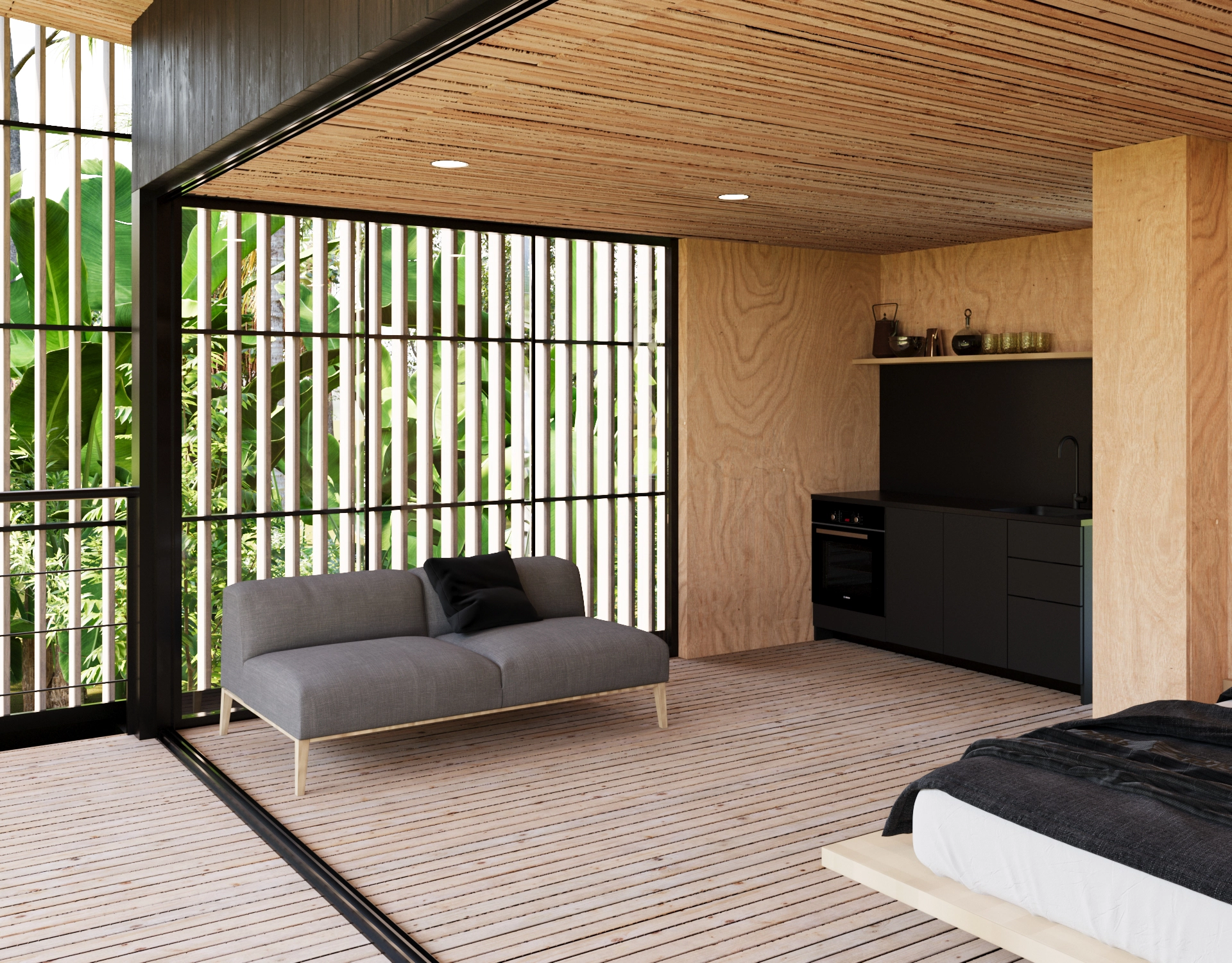 Immerse yourself in nature with this sleek, modern cabin, offering an open-plan design and a cozy atmosphere amidst lush greenery—a perfect blend of comfort and tranquility.